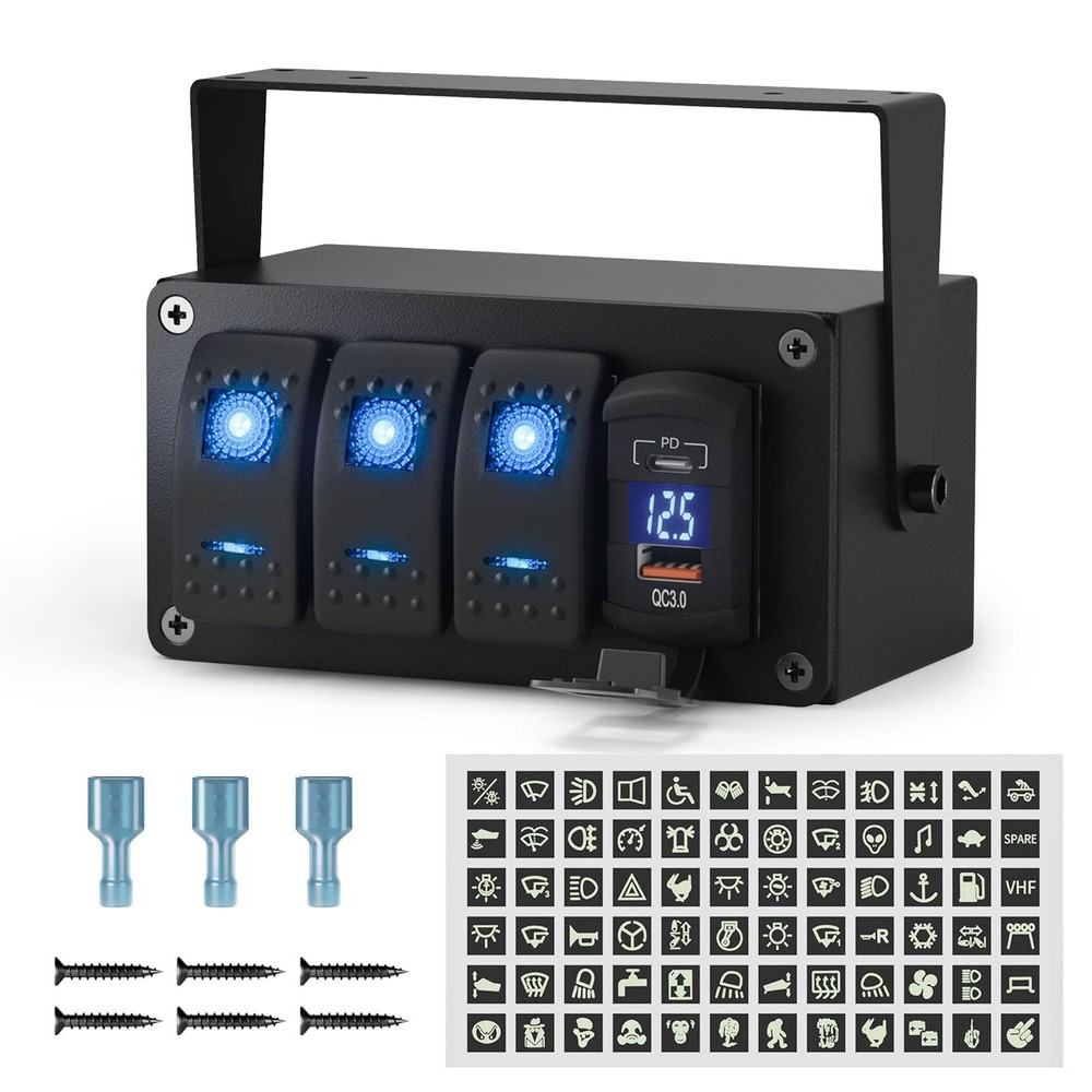 • Nálepky 12/24V multiprepínača s 3x kolískovým spínačom,USB QC3.0,USB-C PD a voltmetrom