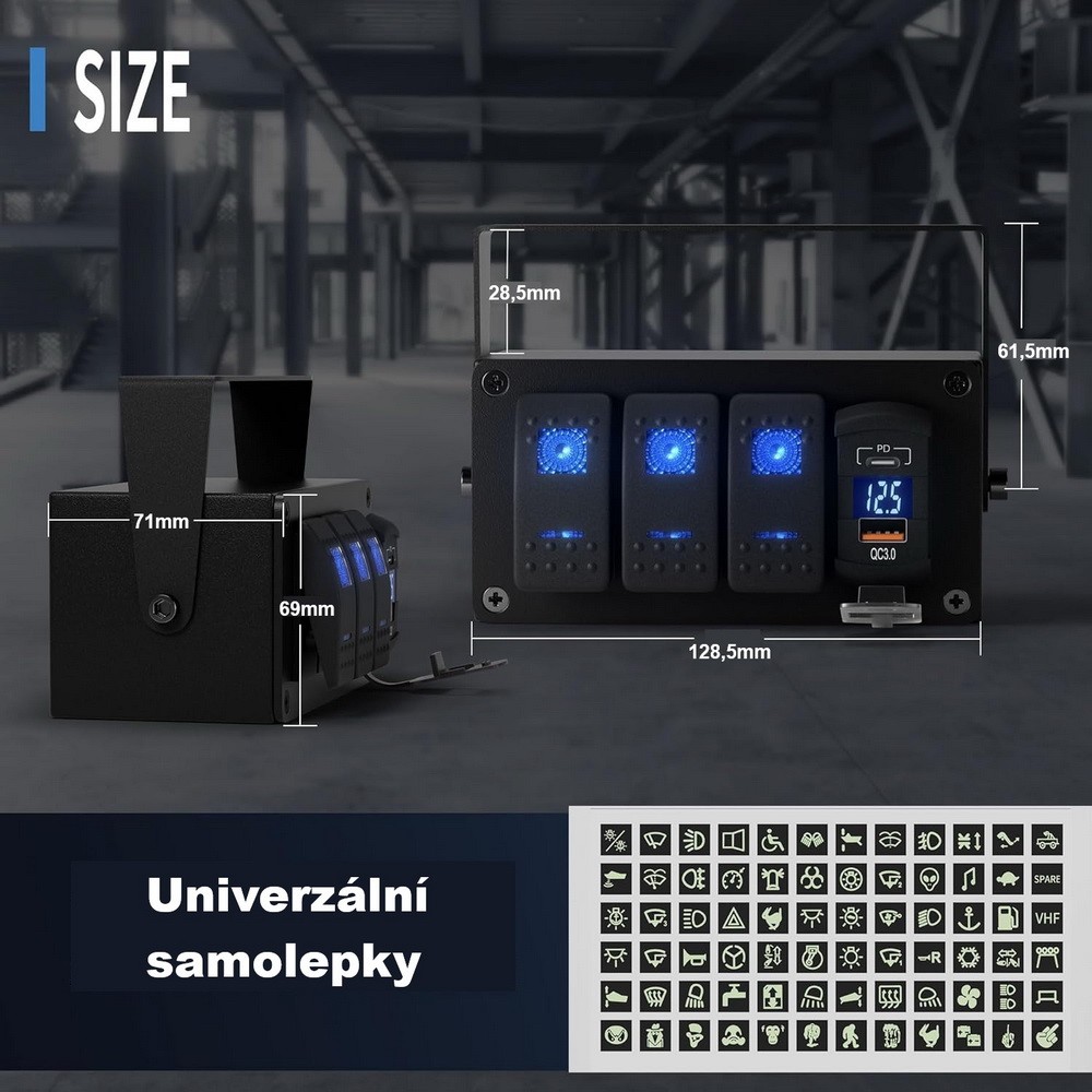 • Panel s 3x spínačmi Rocker, voltmeter + USB/USB-C zásuvka, 12/24V