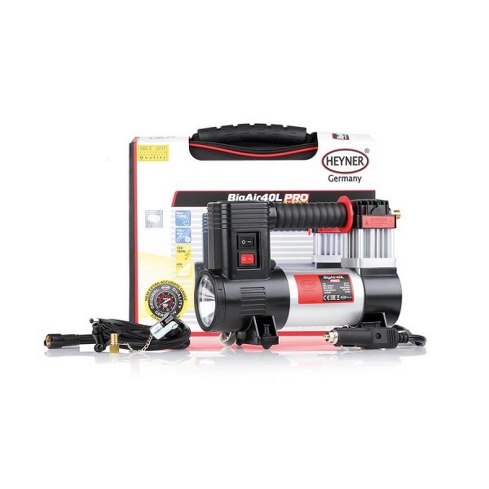 - HEYNER® Premium Big Air 40L je výkonný 12V kompresor určený pre rýchle a spoľahlivé nafukovanie pneumatík na autách, dodávkach, 4x4 vozidlách, motocykloch, bicykloch či nafukovacích člnoch.