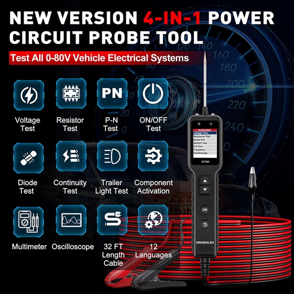 • Prístroj je napájaný priamo z vozidla v rozsahu 8–32 V a kombinuje funkcie klasického testera s pokročilými meracími možnosťami vrátane merania frekvencie a osciloskopu.