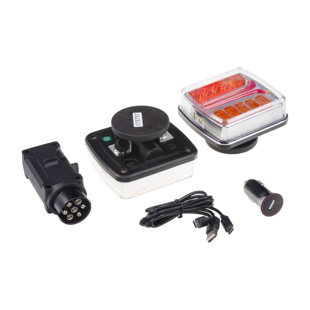 • Dve bezdrôtové združené zadné LED lampy 12/24 V s dynamickým smerovým svetlom na magnetickom podstavci, vedľa vysielača 7-pin, nabíjacieho kábla a nabíjačky do auta