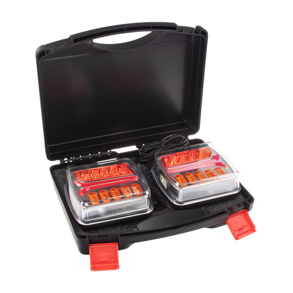 • Dve bezdrôtové zadné LED svetlá 12/24 V uložené v otvorenom prepravnom kufríku s penovou výplňou