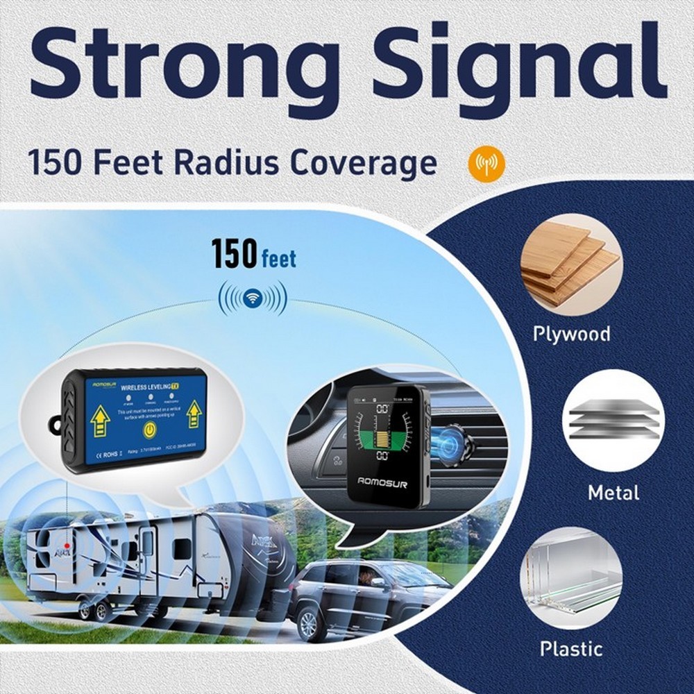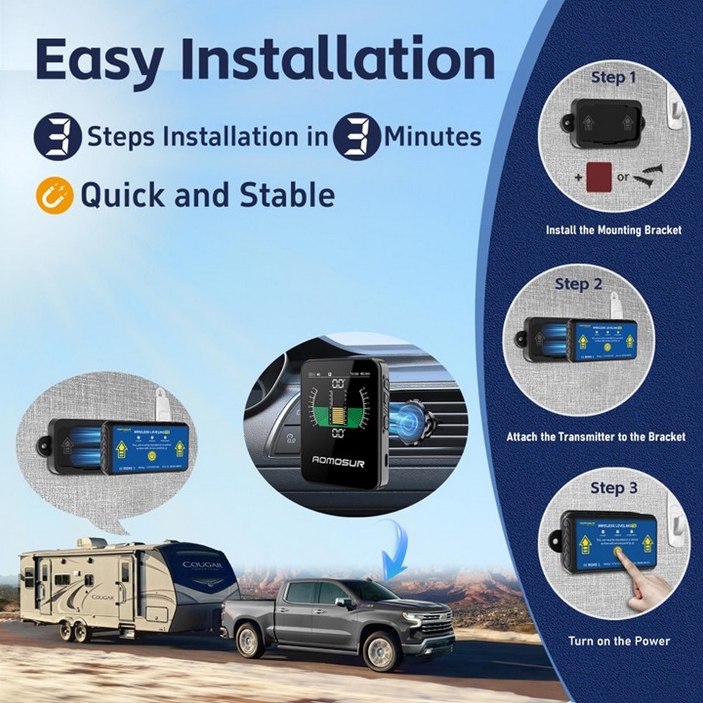 Snímač sa pripevní magnetickým držiakom na zvislú plochu karavanu za menej ako 3 minúty a s displejom komunikuje cez Bluetooth s dosahom až 45 m. Signál prechádza cez drevo, kov aj plast, takže umiestnenie snímača nie je obmedzené. Displej zobrazuje grafické znázornenie náklonu – okamžite vidíte, ktorá strana je nízko a o koľko stupňov.